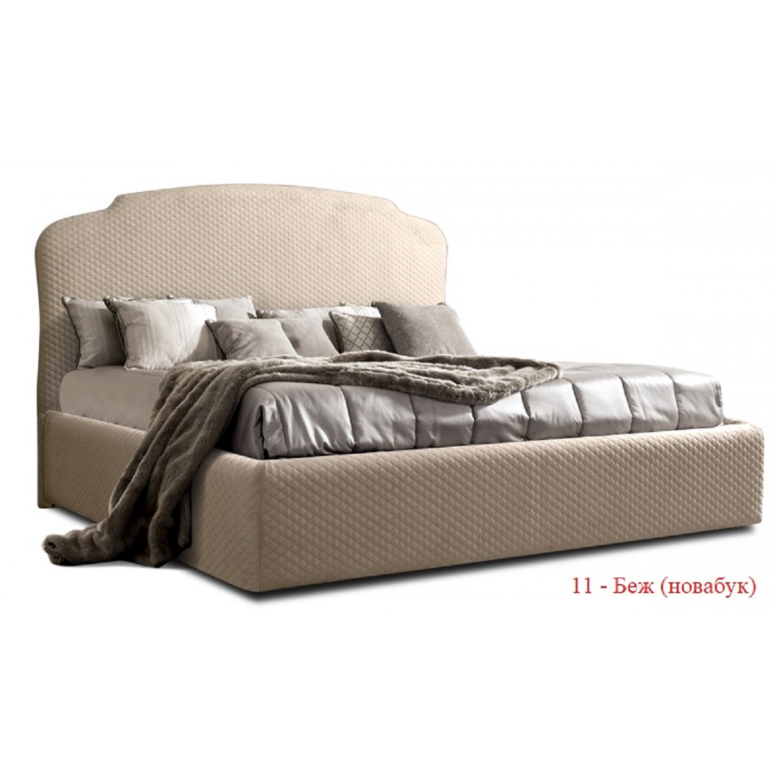 В этой кровати отсутствует изножье, есть только высокое изголовье фигурной формы. Если говорить о материале обивки, то это ткань из каталога итальянского производителя Novabuk.