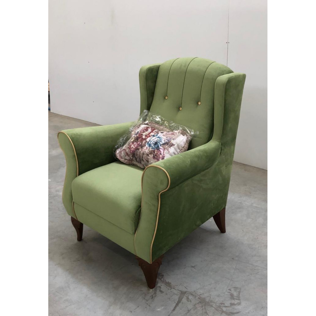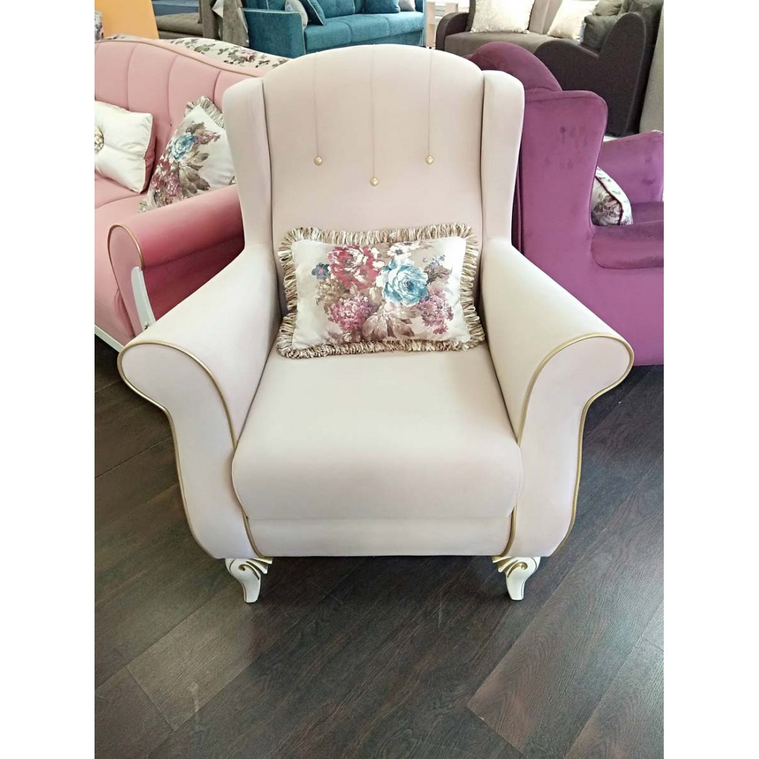 Каркас кресла ASTR-03   древесина твердых пород, фанера, спинка и сиденье на эластичных лентах. Настил сиденья и спинки спанбонд, войлок. Мягкий наполнитель сиденья, кресла фигурный блок из пенополиуретана Н140мм., синтепон. Мягкий наполнитель спинки пенополиуретан. Чехол спинки кресла ткань мебельная с декоративной стежкой. Чехол спинки декорирован тремя обтяжными пуговицами из винилискожи золотистого цвета. Чехол сиденья кресла ткань мебельная. Боковины по переднему контуру декорированы кантом, кант фитиль ПВХ обтянут винилискожей золотистого цвета. Кресло комплектуется декоративной подушкой. Наполнитель подушки комфорель-волокно, крошка поролона. Чехол ткань декоративная букет, а также тафта. Подушка декорирована по периметру тесьмой с бахромой. Ножки кресла декоративные пластиковые.