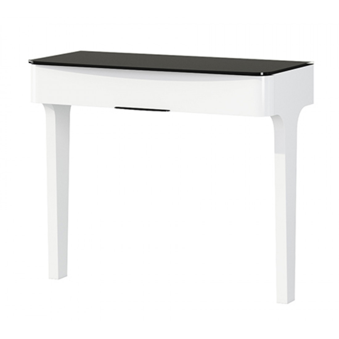 Пристенный туалетный столик в спальню МН-024-07 серии Верона от Мебель-Неман представляет собой легкую консольную конструкцию, с изящными ножками, выдвижным ящиком и черной глянцевой столешницей. Купить белый приставной столик можно в качестве изящного туалетного столика или полки.