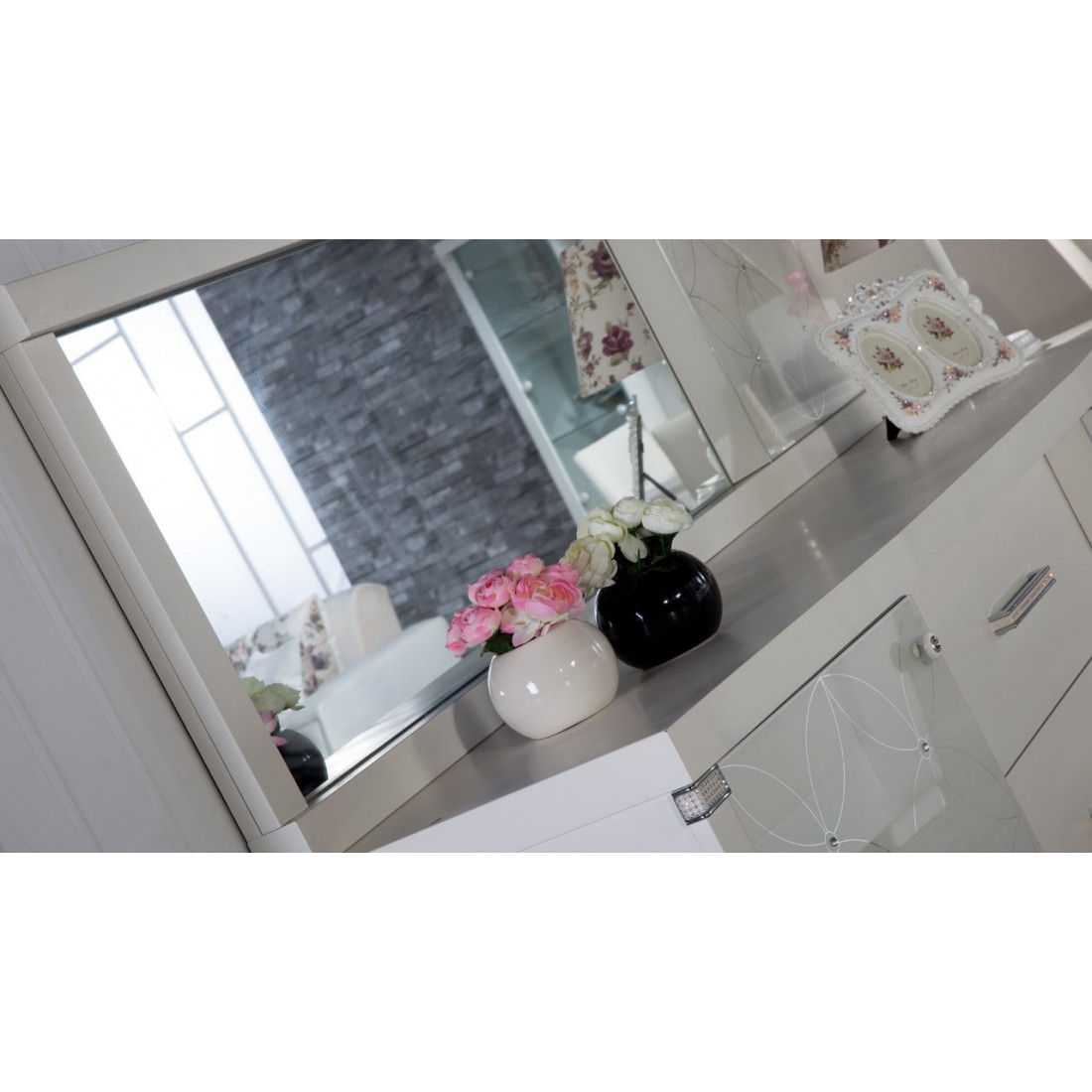 Прямоугольное настенное зеркало MIRA-10 (белое) серии Мира от Беллона предлагается в качестве комплекта к удлиненному комоду. Такуже купить стильно оформленное настенное зеркало можно отдельно. Оно добавить лоска и очарование в общий интерьер, станет притягательным элементом декора: интересное деление на ассиметричные секции дополняется глухой вставкой из матового каленого стекла с лаконичным орнаментом в виде сходящихся соцветий, окончания листьев рисунка украшены стразами Swarovski.