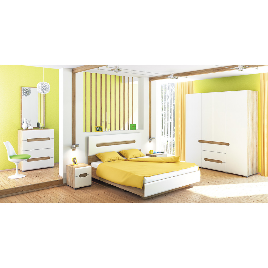 Спальня Леонардо по стильному исполнению соответствует последним трендам в мире интерьерной моды. Минималистичность дизайна и выдержанность леконичных форм подчеркивают самодостаточную красоту игры полутеней на блистательно белоснежном глянце поверхностей. Большую выразительность и многогранность белому цвету в офомлении придает ненавязчивая и благородная фактура дуба сонома – благодаря имитации шпонированных поверхностей спальный гарнитур приобретает вид более спокойного и умиротворяющего, вносит ощущение гармонии и спокойствие в интерьер.