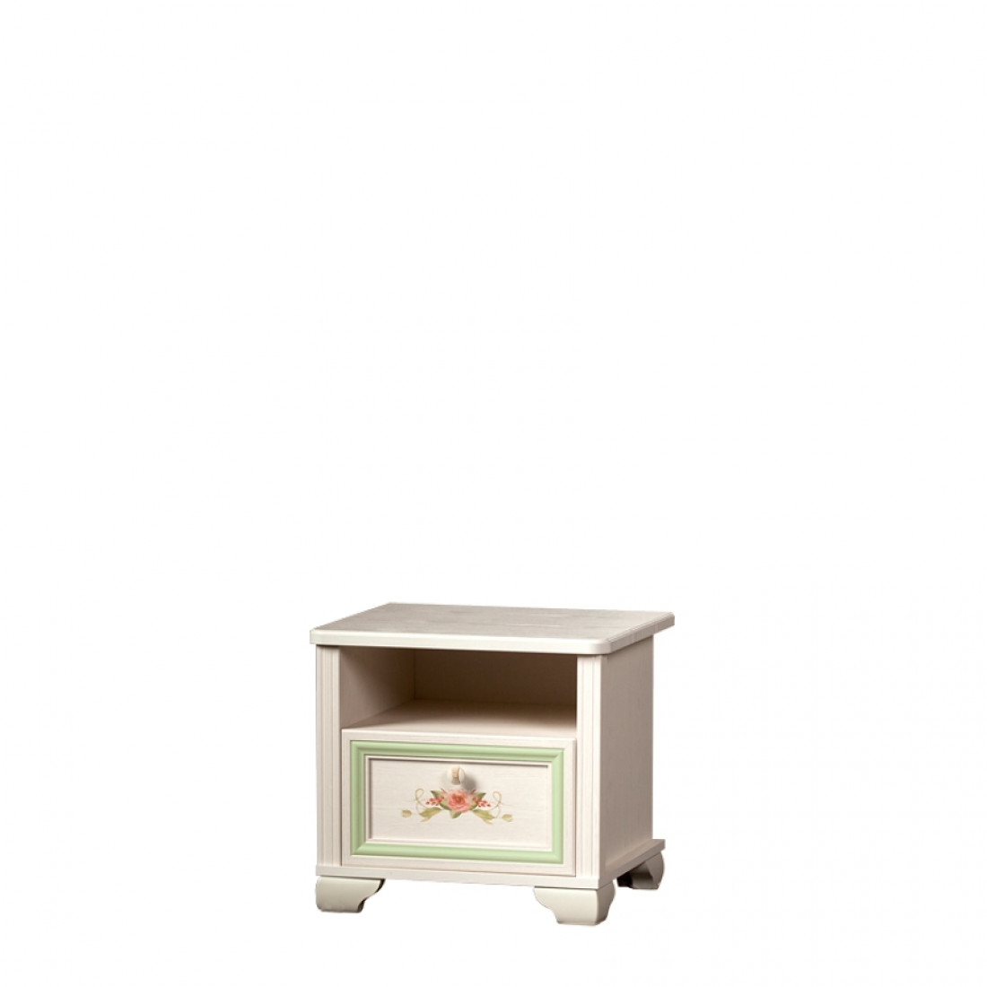 Золотистые ручки с белой патиной подчеркивают классический стиль мебели