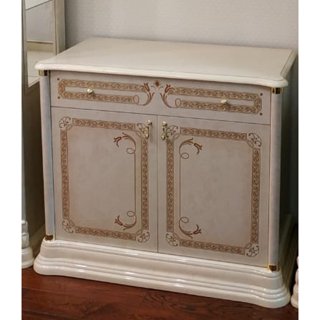 Тумба Роза (беж) от фабрики ДИА мебель выполнена в классическом стиле. Бежевый цвет в сочетании с глянцевым покрытием и золотистым орнаментом на фасаде придает этой модели изящность и элегантность. Удивит вас своей вместимостью и компактностью. Послужит идеальным дополнением к другим модулям вашей гостиной.